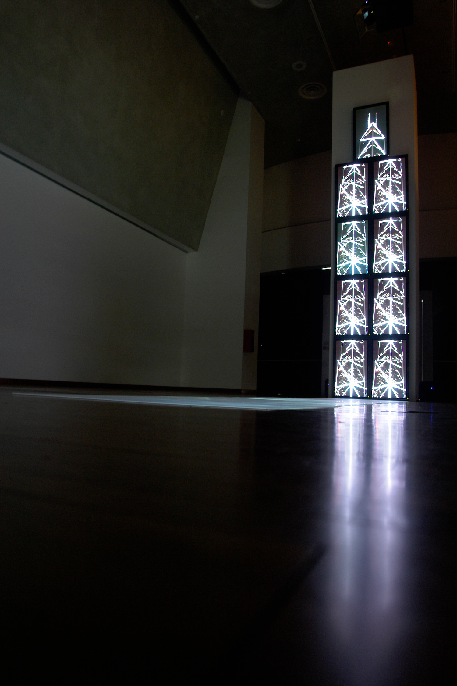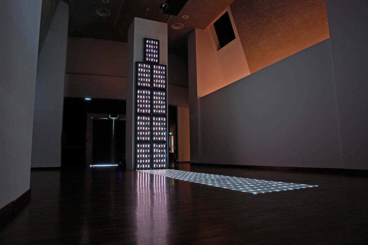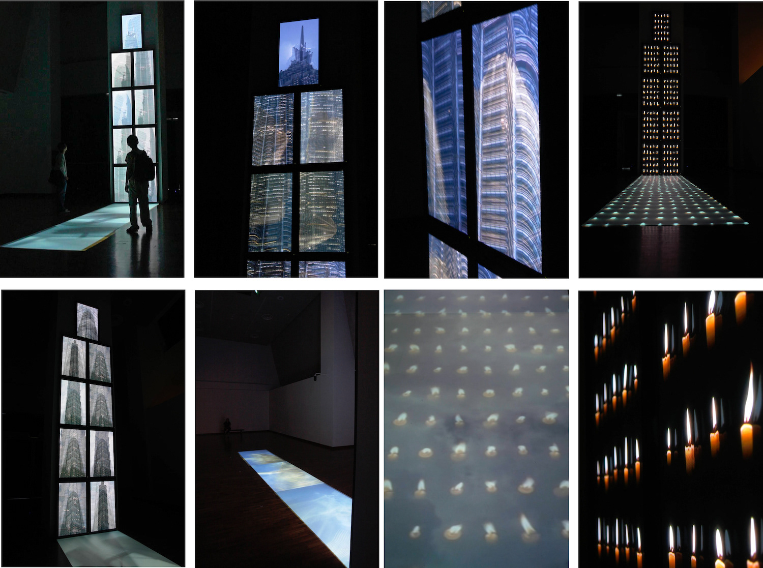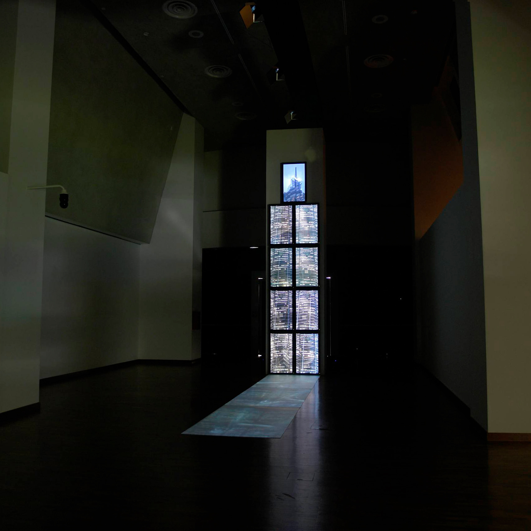 12 Channel video reflection on the social significance of skyscrapers with 9 LCD screens, a 7-metre tower and 3 floor projections, HD video